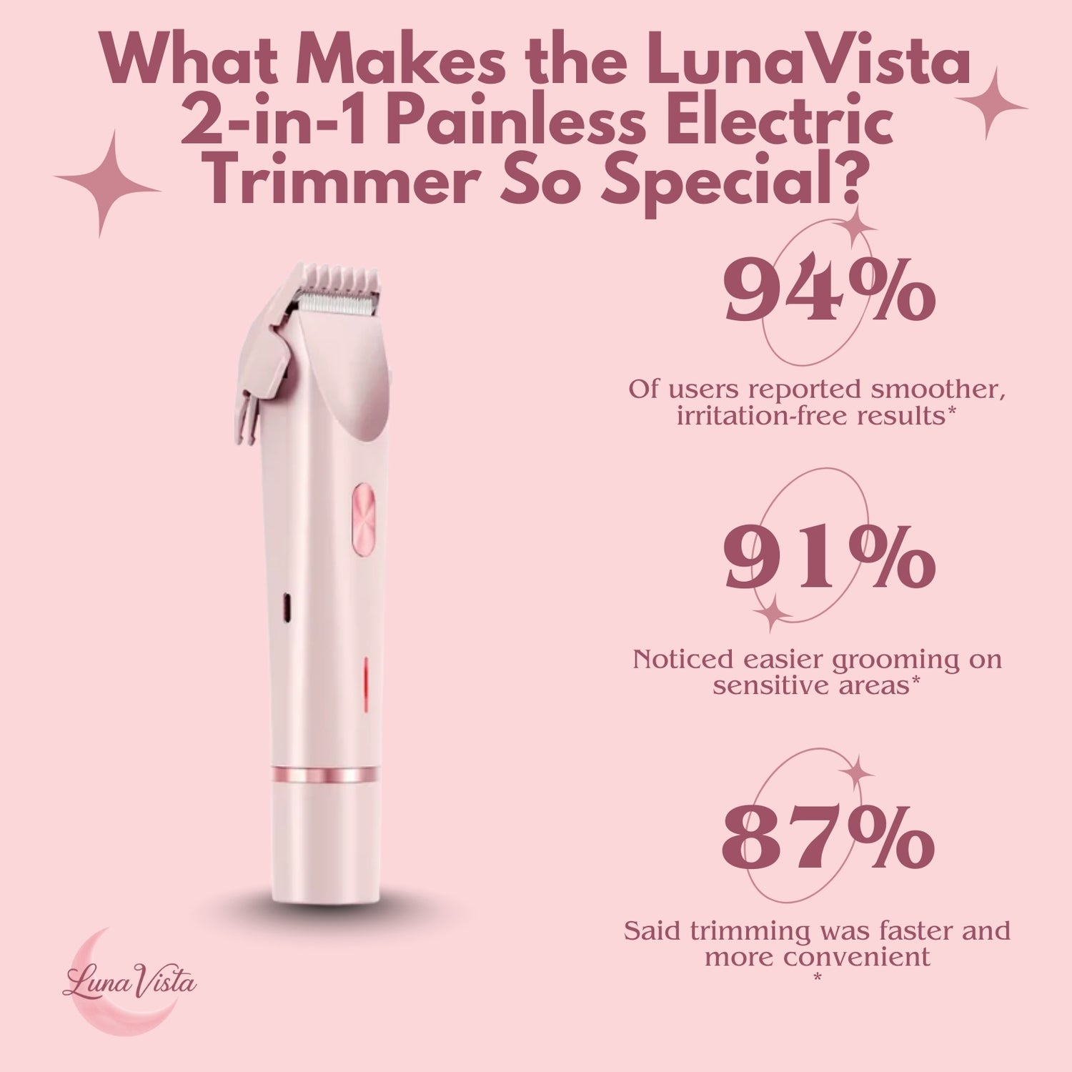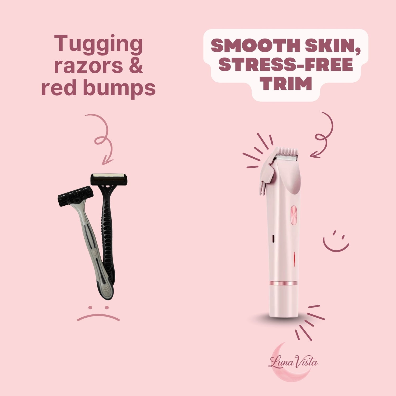 Join thousands who’ve ditched razors for the LunaVista 2-in-1 Painless Electric Trimmer. With smoother, irritation-free results, effortless grooming on sensitive areas, and faster trims, it’s the upgrade your routine deserves.
